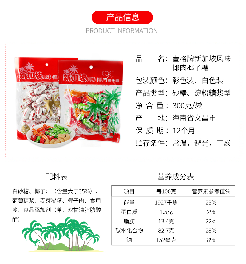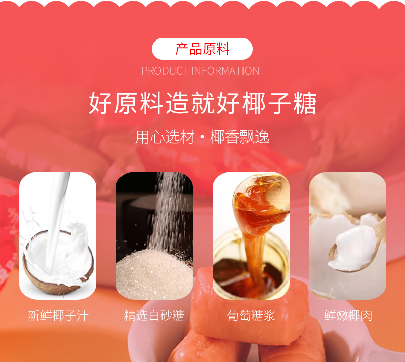 白砂糖、椰子汁(含量大于35%)、葡萄糖漿、麥芽糊精、椰子肉、食用鹽、食品添加劑(單,雙甘油脂肪酸酯)
